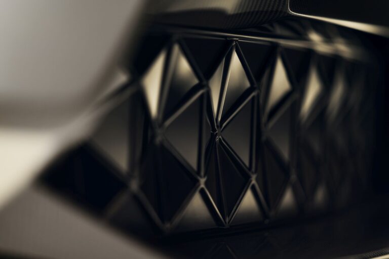 Niżej, przednia aktywna kratka Eletre to sieć połączonych trójkątnych płatków, które dominują w centralnej części. Starannie zaprojektowane, pozostają zamknięte, gdy samochód jest w spoczynku lub gdy konieczne jest zmniejszenie oporu podczas jazdy. Otwierają się w charakterystyczny sposób, aby dostarczyć powietrze do chłodnicy, pozwalając Eletre 'oddychać’, gdy wymagane jest chłodzenie silników elektrycznych, akumulatorów i hamulców przednich. To kolejny przykład porowatości tego samochodu oraz oferuje korzyści aerodynamiczne.