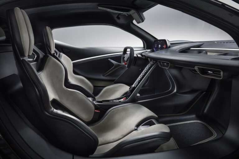 Wewnątrz kabina utrzymuje doskonałą równowagę między dokładnością funkcjonalności samochodu wyścigowego, a komfortem samochodu drogowego. Pozycja kierowcy jest w pełni regulowana, aby pomieścić jak najszerszy zakres pasażerów. Eleganckie siedzenia z karbonową skorupą są ręcznie wykończone grubymi poduszkami z Alcantary i mają manualną regulację przodu/tyłu oraz elektryczną regulację oparcia. Kolumna kierownicy jest ręcznie regulowana w zakresie kąta i długości. Trzypunktowe pasy bezpieczeństwa są standardowo wyposażone, a czteropunktowe pasy są opcją. Wbudowane w nadwozie, w pobliżu punktu biodrowego pasażerów, znajdują się dwa dedykowane obszary do przechowywania.