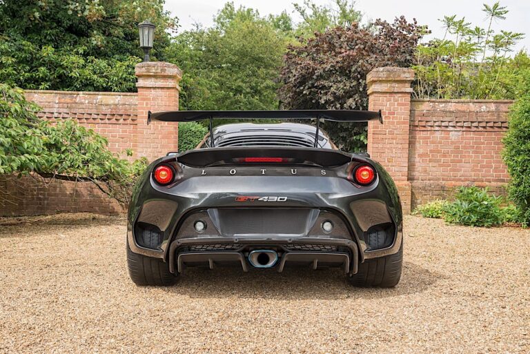 Tył Lotusa Evora GT430 również otrzymał tę samą uwagę do detali, z głębokimi, rzeźbionymi kanałami za każdym kołem, które jak najszybciej odprowadzają przepływ powietrza z nadkoli, poprawiając docisk. Dominującym elementem jest duże, wysoko zamontowane, aerodynamicznie efektywne skrzydło z włókna węglowego.