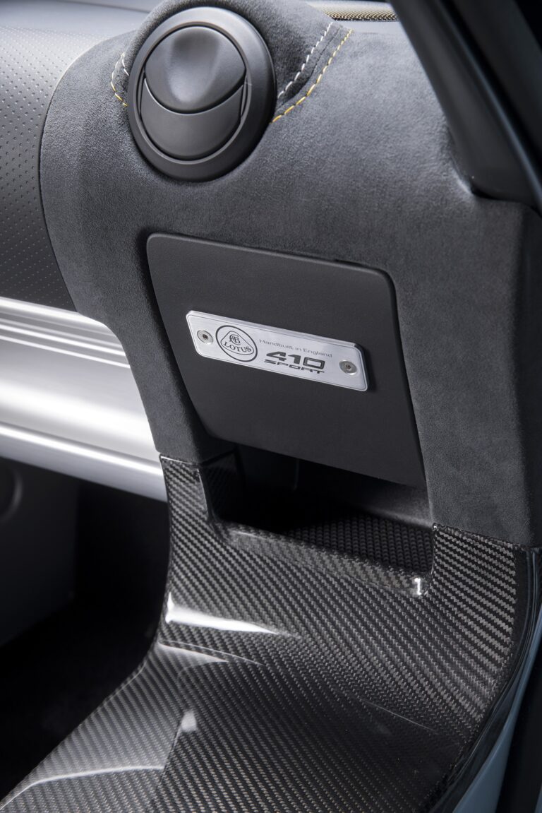 Pracując z perspektywy Lotusa jako lidera w dziedzinie lekkiego designu, każda gram została uzasadniona, począwszy od standardowego lekkiego karbonowego splittera przedniego i panelu dostępu z przodu, po karbonowe boczne elementy, tylne drzwi i skrzydła z tyłu.