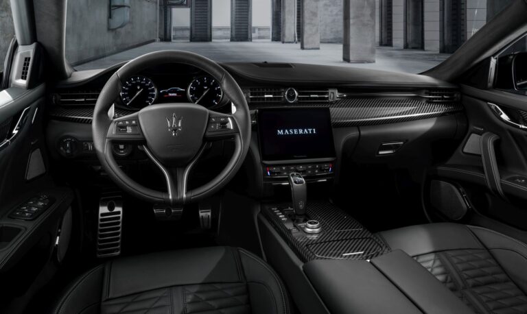Charakterystyka Trofeo kontynuuje się w wnętrzu, z nowym panelem sterującym, który wyświetla ekskluzywny interfejs po włączeniu, podczas gdy zagłówki noszą emblemat Trofeo z nazwą w trójwymiarowym reliefie. Ekskluzywność obejmuje również wykończenia wnętrza, wykonane z naturalnej skóry Pieno Fiore o pełnym ziarnie.