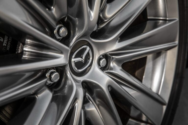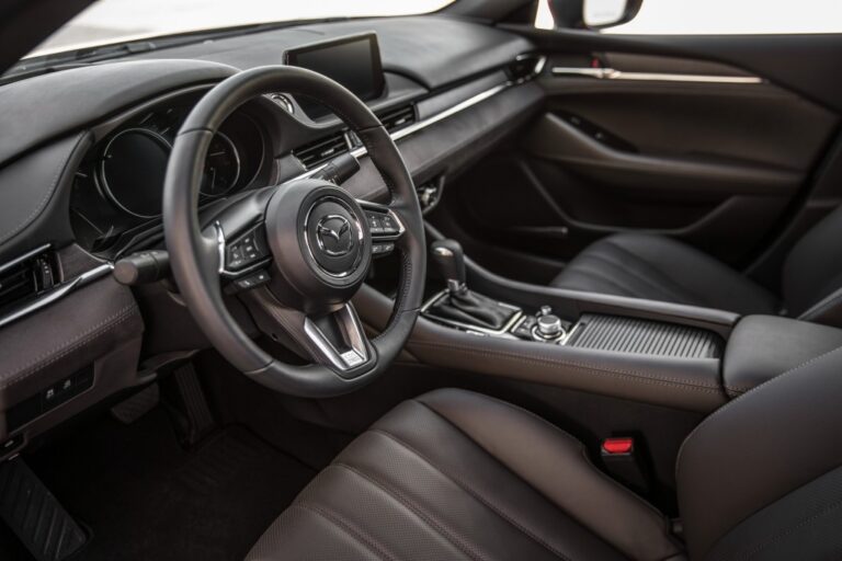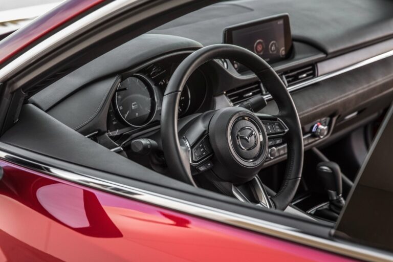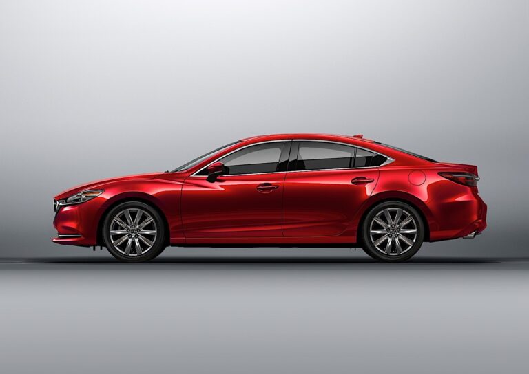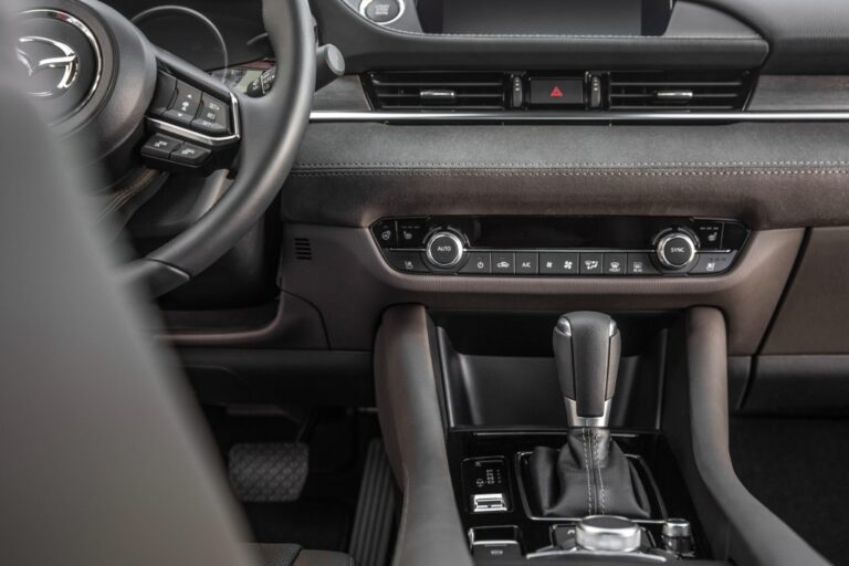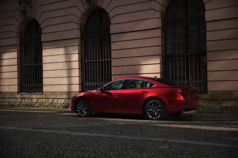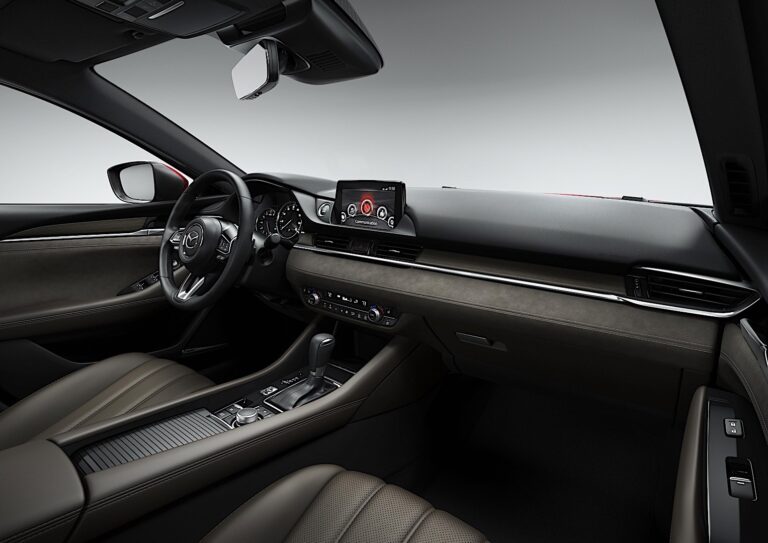 Z przodu znajduje się nowy grill Mazdy6, który akcentuje głębię, z mocną ramą, niskim środkiem ciężkości i szerokim stoiskiem. Standardowe reflektory LED integrują światła przeciwmgielne i oferują wyraźny, szeroki podpis świetlny. Malowane powierzchnie sięgają niżej na nadwoziu, a nowe wzory kół o średnicy 17 i 19 cali uzupełniają odnowiony wygląd. Na koniec, lakier Soul Red Crystal debiutuje w sedanie Mazdy, dołączając do odcienia Machine Gray Metallic i pełnej palety dostępnych kolorów.