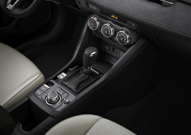 Jak w wielu aspektach japońskiego designu, nacisk położono na eliminację tego, co zbędne. Jednak to nie powstrzymało zespołów projektowych i inżynieryjnych Mazdy przed dodaniem tego, co istotne. Być może największą zmianą wewnątrz jest nowo zaprojektowane konsola centralna i podłokietniki CX-3. Przejście na elektroniczną hamulec ręczny z funkcją auto-hold nie tylko poprawia funkcjonalność pojazdu, ale także dało projektantom Mazdy dużo miejsca do przemyślenia konsoli centralnej, która teraz posiada nowe uchwyty na kubki, schowek w konsoli centralnej oraz zintegrowany podłokietnik. Podłokietnik pokryty jest miękką wyściółką, co podnosi jakość i odczucie CX-3.