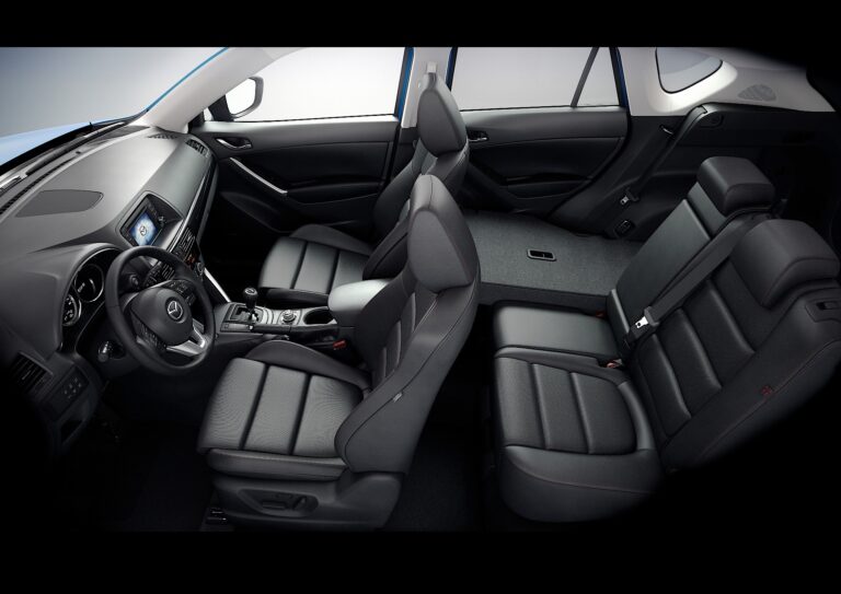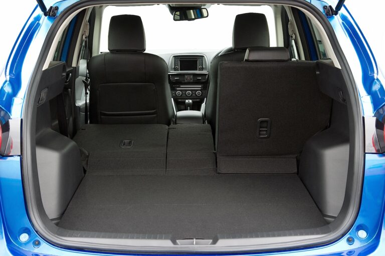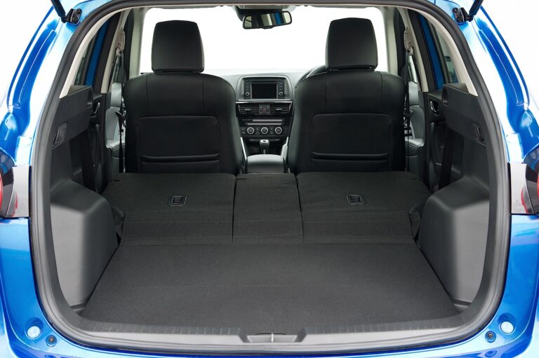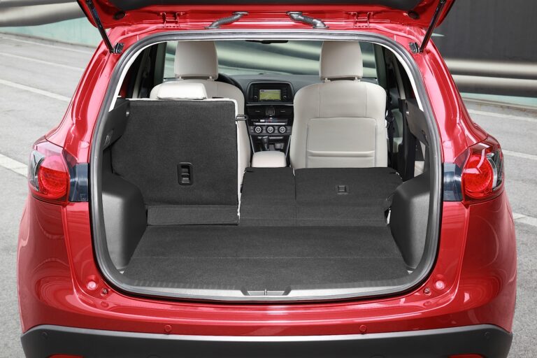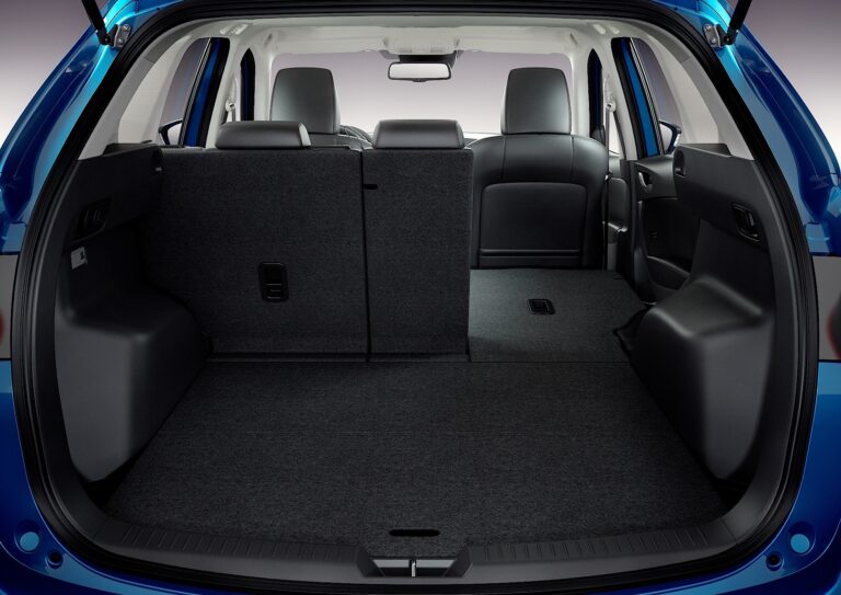 Z tyłu CX-5 posiada unikalną funkcjonalność Karakuri, w tym niezależne siedzenia z dzieleniem 4:2:4 z dźwigniami do zdalnego zwalniania dla wszystkich trzech sekcji. Działa to za pomocą dźwigni jednoczesnego działania, które są wygodnie umieszczone w górnym wykończeniu po obu stronach bagażnika lub za pomocą przycisków umieszczonych na górze siedzeń wewnątrz samochodu, dzięki czemu tylne siedzenia składają się do praktycznie płaskiej przestrzeni ładunkowej, zapewniając maksymalną elastyczność. Środkowa sekcja może pełnić rolę piątego miejsca, środkowego podłokietnika z wbudowanymi uchwytami na kubki lub składać się, aby transportować długie przedmioty. A dostępne jest również wystarczająco miejsca na dwa foteliki dziecięce lub dwóch dorosłych, aby siedzieć w wygodnych warunkach.