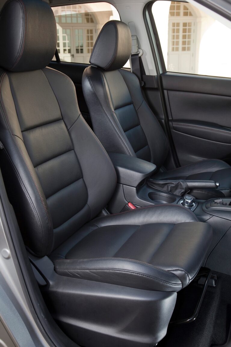Jeśli chodzi o tapicerkę, dostępna jest skóra i dwa rodzaje materiału na siedzenia i wykończenia w dwóch kolorach: czarnym (dla czystej sportowej atrakcyjności) i piaskowym (dla jaśniejszego, bardziej żywego wyglądu). Najwyższy pakiet wyposażenia obejmuje skórę z eleganckim podwójnym przeszyciem i perforacjami optymalnie zaprojektowanymi, by tłumić dźwięk. Z kolei warianty materiałowe maksymalizują sportowy, mocny wizerunek Mazdy CX-5.