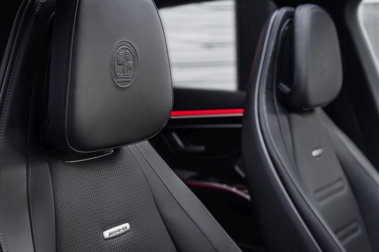 Wnętrze także zdominowane jest przez cechy definiujące styl AMG. EQS53 4MATIC+ oferuje sportową atmosferę, dzięki siedzeniom AMG z indywidualnymi grafikami i specjalnymi pokryciami siedzeń w sztucznej skórze ARTICO z mikro-fibrą MICROCUT oraz czerwonymi kontrastowymi przeszyciami. Alternatywnie, dostępne są opcjonalnie obicia siedzeń w skórze nappa, również z grafiką specyficzną dla AMG.