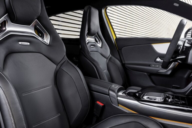 Wnętrze A35 4MATIC podąża za logiką osiągów wejściowych Mercedes-AMG, oferując pokrycia siedzeń w skórze ARTICO z mikrofibry DINAMICA w kolorze czarnym, z czerwonym kontrastującym przeszyciem i czerwonymi pasami lub skórze ARTICO w czarnym/digitalnym szarym. Czerwone lamówki na elemencie wykończeniowym z mikrofibry DINAMICA oraz dysze wentylacyjne z czerwonym pierścieniem dodają dodatkowych akcentów.