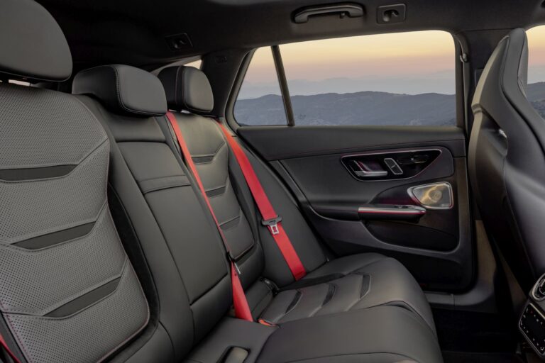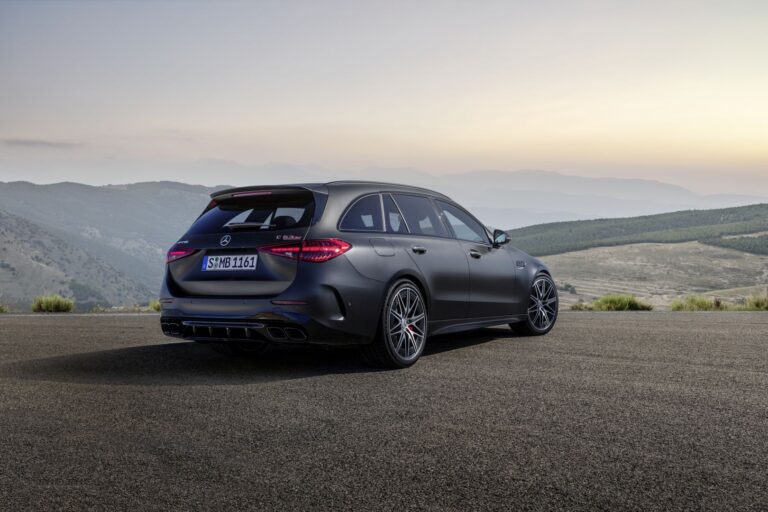 Dopasowane progi boczne, tylny zderzak z dużym dyfuzorem oraz dwa trapezoidalne, zewnętrznie żebrowane końcówki wydechu dopełniają design. Ekskluzywne detale z tyłu obejmują specjalny brzeg powietrzny na pokrywie bagażnika (spoiler dachowy w wersji kombi), klapkę do ładowania oraz oznaczenie modelu na czerwonym tle. Emblemat „E PERFORMANCE” na błotnikach wskazuje na hybrydowy napęd. C63 S standardowo wyposażony jest w 19-calowe lekkie felgi AMG o mieszanych oponach. Dostępne są opcjonalne kombinacje kół/opon w rozmiarze 20 cali, również o mieszanych oponach, w tym nowa felga kuta.