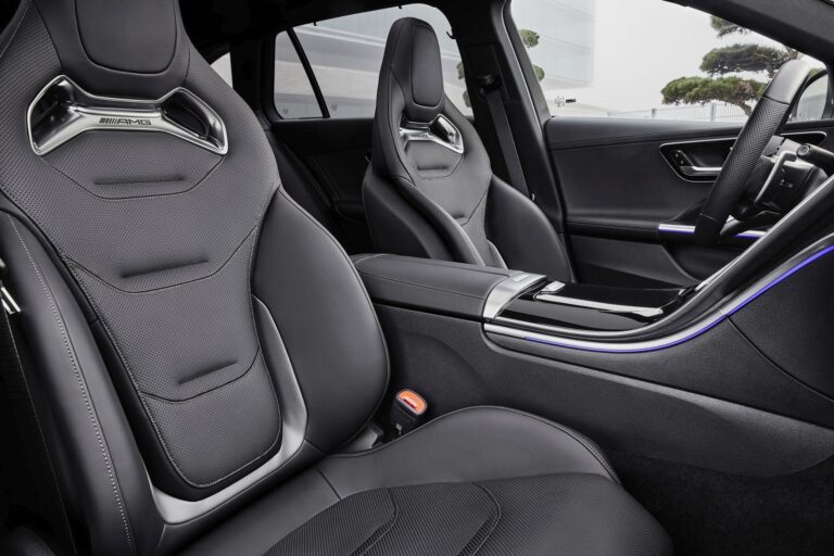 Wnętrze wzbogacają takie elementy jak fotele AMG z charakterystycznym układem tapicerki oraz pokryciami siedzeń z sztucznej skóry ARTICO i mikrofibry MICROCUT w kolorze czarnym z czerwonymi kontrastowymi szwami oraz czerwonymi pasami bezpieczeństwa, co nadaje im sportowego charakteru. Dodatkowe opcje obejmują pokrycia siedzeń ze skóry i skóry nappa. Do tego dochodzi sportowa kierownica AMG ze skóry nappa, z płaskim dolnym odcinkiem, perforowaną w strefie chwytu oraz z aluminiowymi łopatkami. Dwa okrągłe przyciski na kierownicy AMG umożliwiają szybkie i precyzyjne sterowanie różnymi dynamicznymi funkcjami jazdy oraz programami jazdy AMG DYNAMIC SELECT. Deska rozdzielcza i linie nadwozia są pokryte sztuczną skórą ARTICO z czerwonymi przeszyciami. Sportowo-luksusowa atmosfera dopełniają sportowe pedały AMG, dywaniki podłogowe AMG oraz podświetlane listwy progowe z napisem AMG.