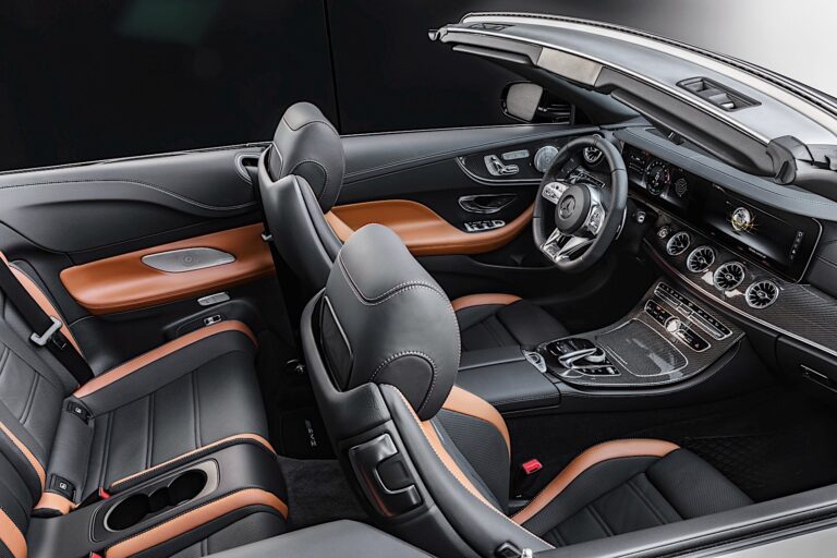 Synteza ekskluzywności i sportowości jest również podkreślana przez fotele sportowe (z integralnym wyglądem fotela w modelu E53 4MATIC+ Coupé i Cabriolet) z układem tapicerki specyficznej dla AMG oraz oznaczeniem AMG, czerwonymi pasami bezpieczeństwa oraz elementami wykończenia w włóknie węglowym lub szklanym w matowym srebrze. Wnętrze dopełnia nowa, standardowo montowana kierownica AMG Performance z nappa ze skórą z opcjami personalizacji, takimi jak wstawki drewniane w wysokim połysku lub mikrofibra DINAMICA w strefie chwytu.