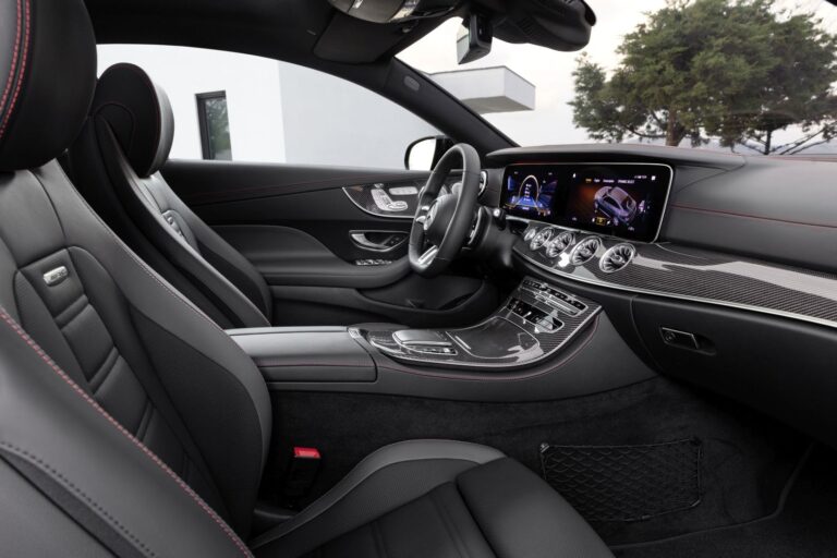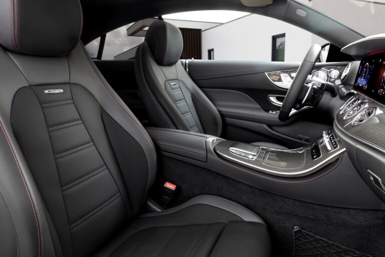 Wnętrze wita pasażerów wyraźnymi detalami, luksusowymi materiałami oraz systemem multimedialnym MBUX najnowszej generacji. Fotele pokryte sztuczną skórą ARTICO/mikrofibrą DINAMICA w czerni z charakterystycznym dla modelu E53 wzornictwem, czerwonym kontrastowym przeszyciem i logo AMG, łączą sportowość z silnym podparciem bocznym i komfortem podczas długich podróży. Dodatkowe elementy wnętrza to czerwone pasy bezpieczeństwa i elementy wykończenia z włókna węglowego. Opcjonalnie dostępne są również inne tapicerki skórzane nappa. Nowością jest nappa w kolorze czarnym/perłowym szarym tytanie z czerwonym kontrastowym przeszyciem.