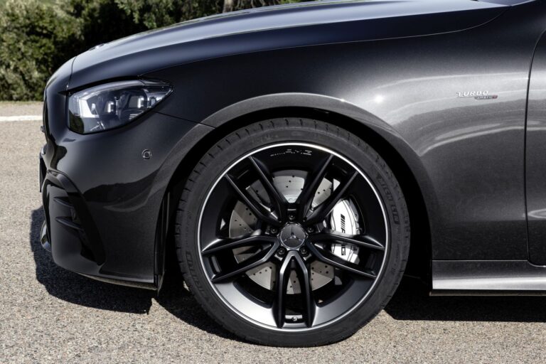 Elektronicznie ograniczona prędkość maksymalna wynosząca 250 km/h może być zwiększona do 270 km/h z pakietem AMG Driver’s Package. System hamulcowy AMG jest optymalnie dostosowany do mocy i wydajności modeli E53: oś przednia ma tarcze o wymiarach 370 x 36 mm z czterotłoczkowymi stałymi zaciskami i oznaczeniem AMG, a oś tylna wyposażona jest w wewnętrznie wentylowane tarcze o wymiarach 360 x 26 mm z jednostłoczkowymi pływającymi zaciskami.