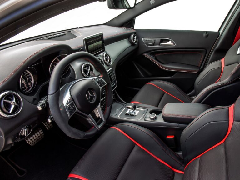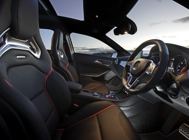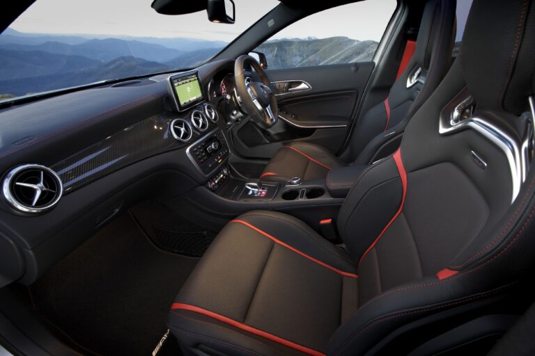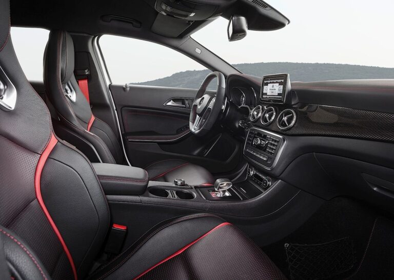 Jak w każdym samochodzie wysokiej wydajności AMG, wnętrze GLA45 AMG cieszy się swoją wysoką jakością połączoną ze sportowym stylem i ekskluzywnymi cechami wyposażenia. Fotele sportowe w sztucznej skórze ARTICO / mikrowłóknie DINAMICA z czerwonym kontrastowym szwem i czerwonymi pasami bezpieczeństwa designo są standardem, podobnie jak jednostka sterująca AMG. Trójramienna kierownica sportowa z nappa w wysokiej jakości skórze z kontrastowym czerwonym szwem, perforowaną skórą w strefie uchwytu oraz łopatkami do zmiany biegów pozwala na doskonałą kontrolę pojazdu. Zestaw wskaźników AMG z 2-rurkowym designem i centralnym wyświetlaczem kolorowym, głównym menu AMG oraz RACETIMER są dostępne, aby informować kierowcę. Po otwarciu drzwi kierowca witany jest ekranem powitalnym AMG. Wykończenie deski rozdzielczej jest z aluminium szczotkowanego, które w połączeniu z aluminiowymi progami drzwiowymi AMG z szczotkowanej stali nierdzewnej podkreśla wysoką jakość i ekskluzywną atmosferę wewnątrz GLA45 AMG.