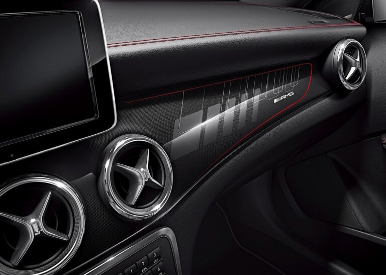 Wnętrze GLA45 AMG „Edition 1” dominuje kolor czarny i czerwony. Czerwony kontrastowy szew zdobi fotele sportowe AMG w sztucznej skórze ARTICO/mikrowłóknie DINAMICA, centralne panele drzwiowe, górną część deski rozdzielczej z sztucznej skóry ARTICO/mikrowłóknie DINAMICA oraz kierownicę z nappa/ mikrowłóknie DINAMICA. Inne wizualne akcenty to dźwignia E-SELECT z wytłoczonym znakiem AMG i odznaka „Edition 1” na jednostce sterującej AMG. Ekskluzywne wykończenie deski rozdzielczej idealnie pasuje do pasów wyścigowych AMG po bokach pojazdu. Powierzchnia wysokiej jakości ma przekonujący wygląd i wrażenie: błyszczące i matowe elementy tworzą ekscytującą zabawę z wzorem diamentowym i napisem AMG po prawej stronie.