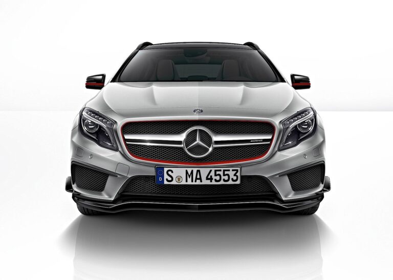 Mercedes-Benz GLA45 AMG „Edition 1” to opcjonalna oferta. Ekspresyjny układ ekskluzywnych detali na zewnątrz i wewnątrz wzbudza czystą fascynację. Czarne, błyszczące wykończenie pakietu aerodynamicznego z większym przednim splitterem, dodatkowymi flikami w przednim zderzaku i tylnym skrzydłem tworzy bezkompromisowe wrażenie toru wyścigowego. Srebrne szare/czerwone pasy AMG na bokach pojazdu poniżej „linii spadku” pozostawiają trwałe wrażenie. Uzupełniają je czerwone akcenty na kratce chłodnicy, lusterkach zewnętrznych, wkładce dyfuzora i tylnym skrzydle. Idealnym uzupełnieniem są czerwone malowane zaciski hamulcowe i felgi aluminiowe AMG w matowej czerni z czerwonymi krawędziami. Felgi aluminiowe posiadają specjalne osłony centralne z wyglądem blokady centralnej i są wyposażone w opony o rozmiarze 235/40 R 20. Pakiet nocny AMG jest również częścią standardowego wyposażenia, podobnie jak emblemat „Edition 1” na przednim błotniku. Lakier metaliczny: czarny kosmos, srebrny polar i szary górski są dostępne jako alternatywa dla białego lakieru z cirrus.