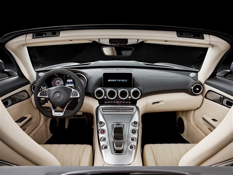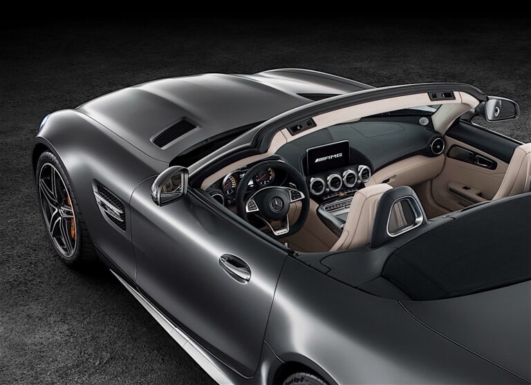 AMG GT C Roadster jest również wyposażony w akumulator litowo-jonowy i ma bardziej ekskluzywne wykończenia. W standardzie znajduje się wnętrze z nappa, sportowa kierownica AMG z nappa/ mikro włóknem DINAMICA oraz dodatkowy tryb transmisji RACE.
