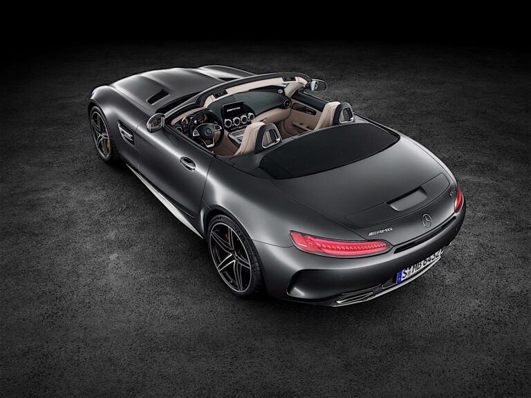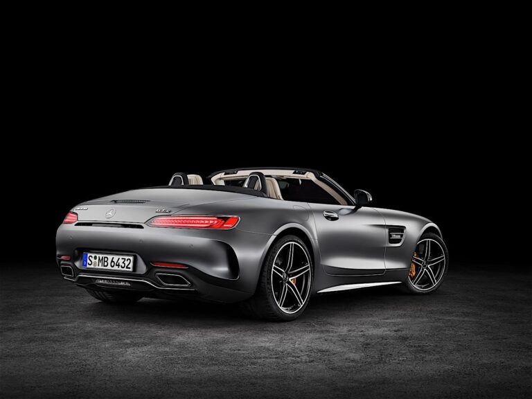 Tylna część również cechuje się licznymi, widocznymi innowacjami. Nowe aluminiowe ścianki boczne AMG GT C Roadster poszerzają otwarty dwumiejscowy pojazd o 57 milimetrów w porównaniu do AMG GT Roadster. To dokładnie szerokość AMG GT R. W porównaniu z AMG GT Roadster, muskularna forma stwarza również przestrzeń dla większych kół i szerszego rozstawu. Obie te zmiany poprawiają przyczepność, umożliwiając osiąganie wyższych prędkości w zakrętach. Również szersze kontury tylnego zderzaka AMG GT C Roadster poprawiają przepływ powietrza z tyłu dzięki dużym zewnętrznym wlotom powietrza. Oba warianty roadstera mają aerofoil zintegrowany w pokrywie bagażnika. Jest on elektrycznie wysuwany i chowany przy określonych prędkościach, w zależności od wybranego trybu transmisji.