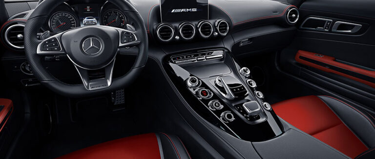 Gra świateł i cieni jest dodatkowo podkreślona przez srebrne pasy bezpieczeństwa i czarne chromowane wykończenie. Na zagłówku siedzenia AMG Performance wybite jest logo „GT Edition 50”.