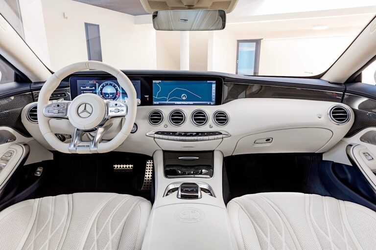 W środku, przednie sportowe fotele były szerokie i wygodne, z regulowanymi bocznymi podparciami. Dwa fotele z tyłu oferowały wystarczająco dużo miejsca na nogi i nad głową dla dorosłych pasażerów. S63 Coupe to prawdziwy pojazd 2+2. Na desce rozdzielczej, model AMG S63 Coupe posiadał 12,2-calowy kolorowy wyświetlacz o dużej rozdzielczości, który reprodukował okrągłe wskaźniki klasycznego zestawu przyrządów.