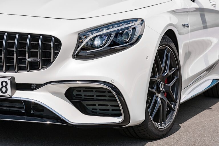 Nowe AMG S-Class Coupé i Cabriolet są od razu rozpoznawalne z przodu dzięki grillowi Panamericana: V-kształtny wlot powietrza harmonijnie podąża za liniami lamp i jest podzielony na chromowane, pionowe szczeliny. Przedni zderzak przypomina unoszone skrzydło samolotu i jest malowany w kolorze nadwozia. Flankują go dwa duże wloty powietrza wykończone na wysoki połysk. Trójwymiarowy splitter z aerodynamicznie ukształtowanym krawędzią z chromu o wysokim połysku zmniejsza unoszenie się na przedniej osi.