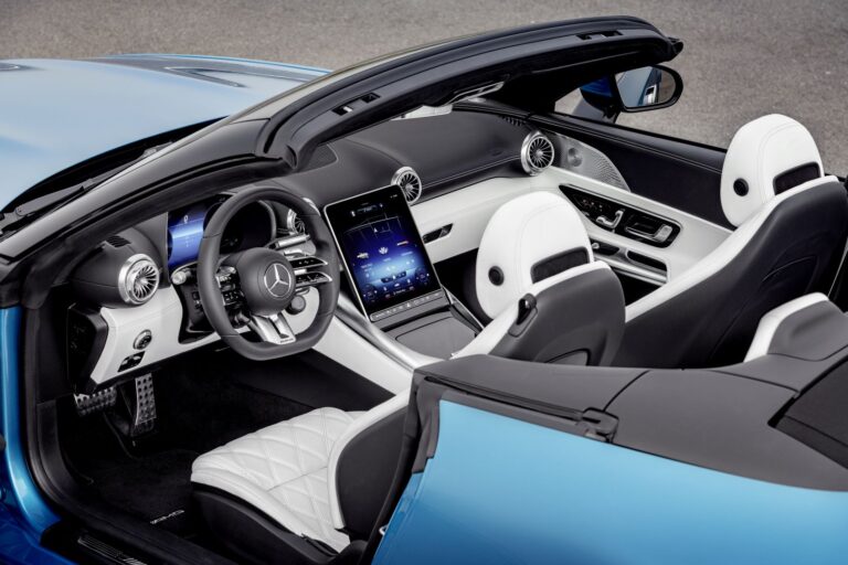 Wnętrze nowego SL przekształca tradycję pierwszego roadstera 300 SL w nowoczesną erę. Dzięki genów sportowych Mercedes-AMG, nowa edycja zaspokaja sportywną grupę docelową, jak również klientów skupionych na maksymalnym komforcie. Wysokiej jakości materiały, staranne wykonanie i dbałość o szczegóły dodatkowo podkreślają wysoki standard luksusu w wnętrzu. Projekt kokpitu, aż po elektrycznie regulowany centralny wyświetlacz w konsoli środkowej, skupia się na kierowcy i urzeka harmonijnym ogólnym wrażeniem. Całkowicie nowa koncepcja wymiarowa z 2+2 miejscami oferuje jednocześnie większą funkcjonalność i przestronność w wnętrzu. System multimedialny MBUX oferuje wybór kilku specyficznych stylów wyświetlania i różnych trybów.
