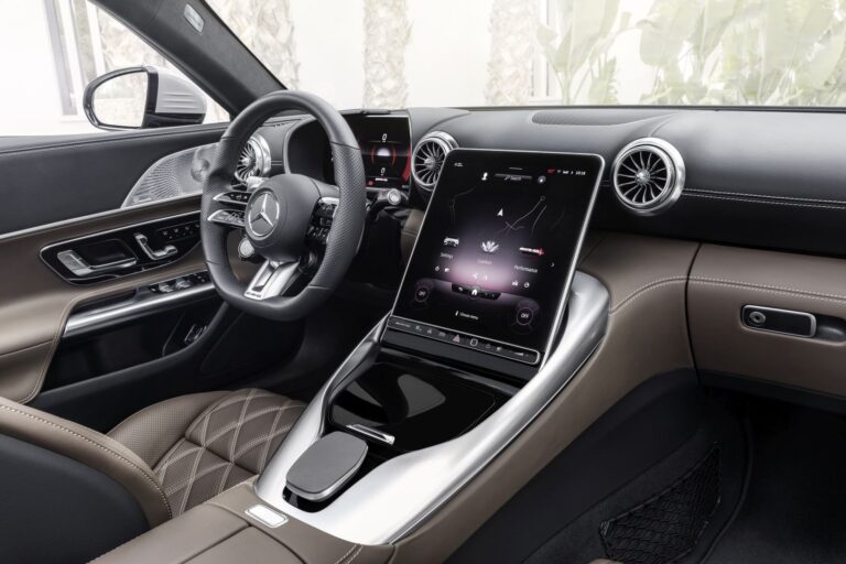 Minimalistyczne wnętrze 300 SL Roadster, wyposażone w wysokiej jakości materiały, zainspirowało projektantów do stworzenia wnętrza nowego modelu: wynikiem tego jest ekscytująca kombinacja analogowej geometrii i cyfrowego świata – nazwanej „hiper analogową.” Przykładem tego jest w pełni cyfrowy zestaw wskaźników, który jest zintegrowany z trójwymiarowym wizjerem. Standardowy system multimedialny MBUX oferuje wybór kilku różnych stylów wyświetlania i trybów.