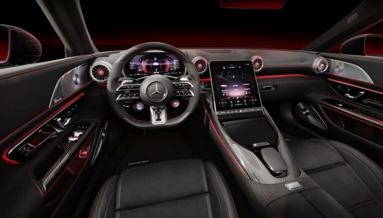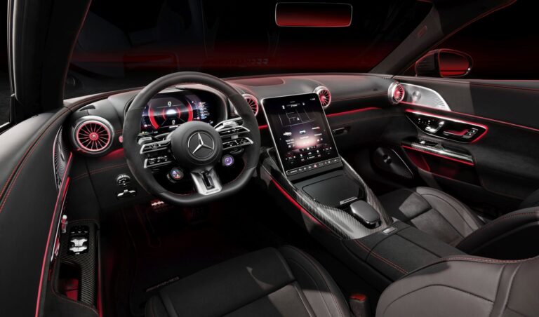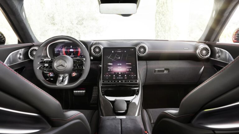 Kokpit był zapierający dech w piersiach, łączący technologię z dbałością o szczegóły. Na przykład, na desce rozdzielczej znajdowały się cztery wentylatory w stylu turbiny oraz duży ekran infotainment dla systemu MBUX. Dla kierowcy, Mercedes-AMG zainstalował wyświetlacz TFT zamiast analogowych wskaźników, prezentując różne informacje, aby ułatwić życie.