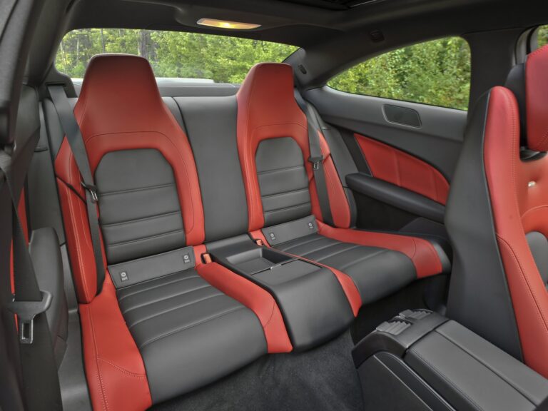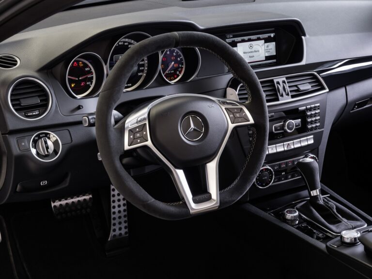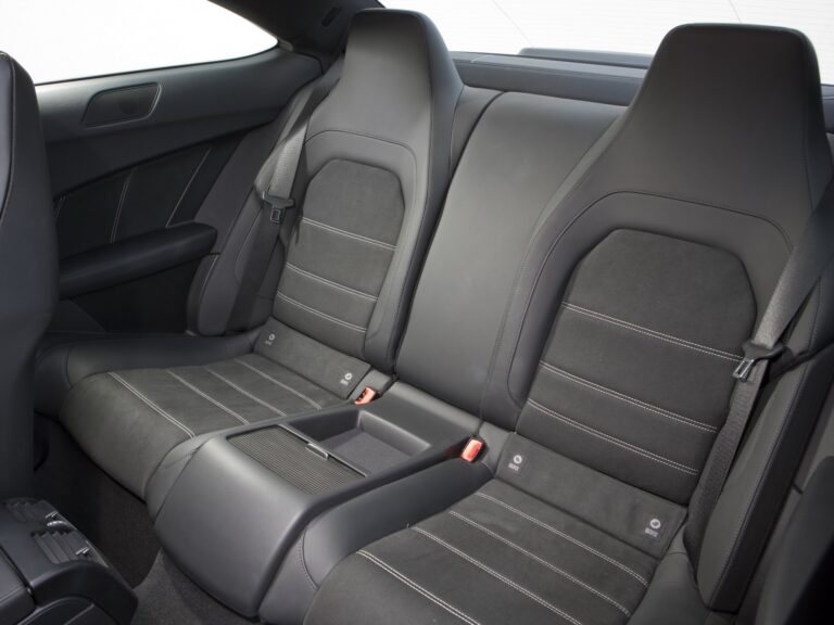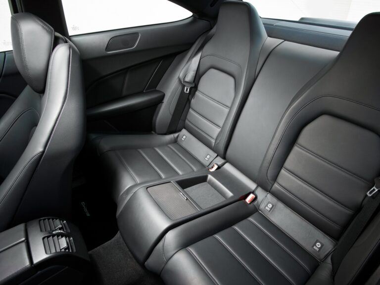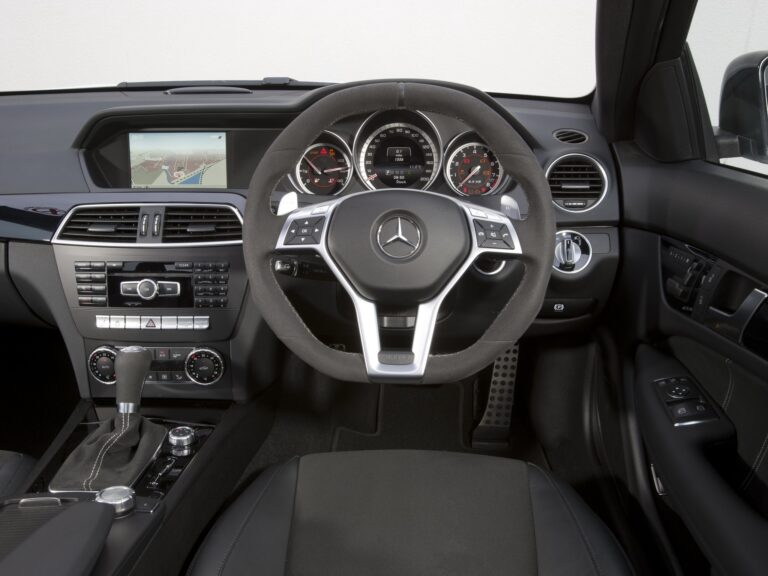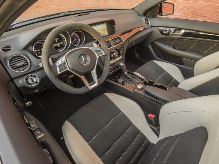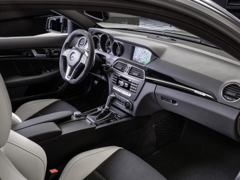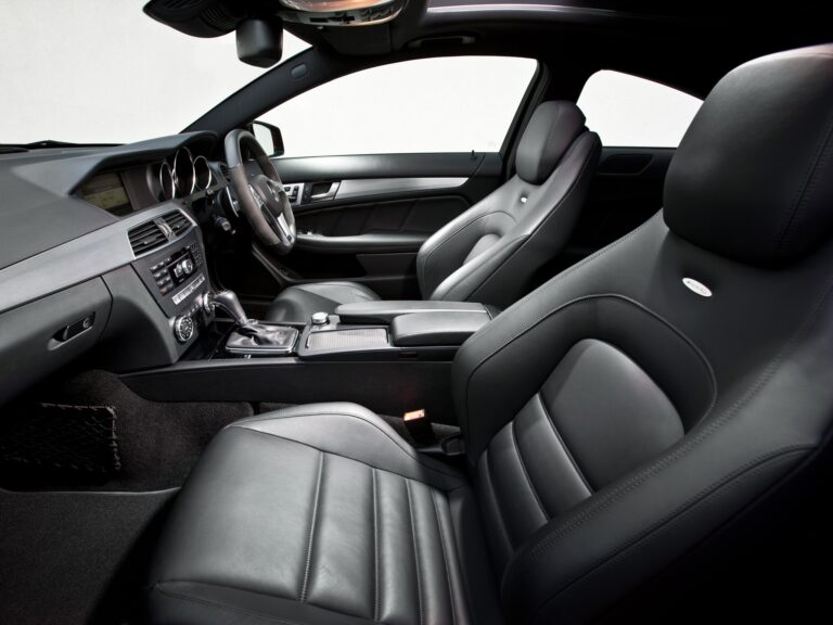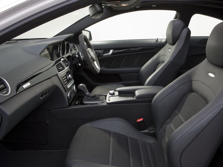 Nowe fotele sportowe AMG z integralnymi zagłówkami, systemem EASY-ENTRY i wysokiej jakości emblematami AMG mają sportowy design z poziomymi przeszyciami. Standardowo dostępna jest tapicerka z materiału ARTICO/DINAMICA w czarnym kolorze. DINAMICA to nowy typ oddychającego materiału syntetycznego, który jest przyjemny w dotyku i charakteryzuje się niską emisją oraz dużą odpornością na blaknięcie. Boksy boczne foteli sportowych AMG są wykończone materiałem ARTICO, natomiast środkowe panele siedzisk są wykończone materiałem DINAMICA. Mercedes-Benz C63 AMG coupé to pełnoprawny czteromiejscowy samochód, a tylne siedzenia mają ten sam styl poziomych przeszyć co fotele sportowe AMG. Aby powiększyć przestrzeń bagażową, oparcia tylnej kanapy mogą być składane jako standard.