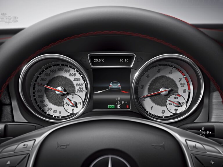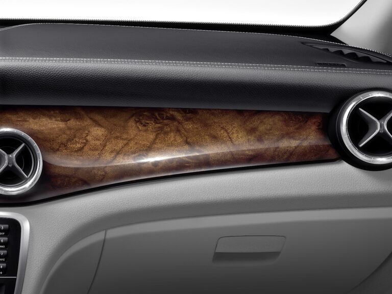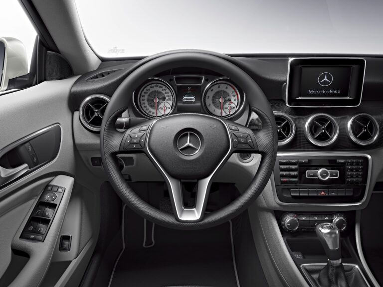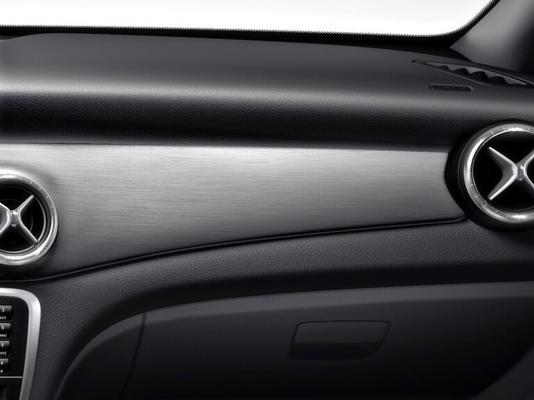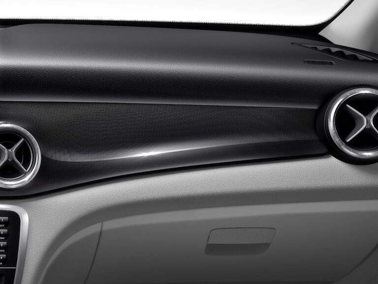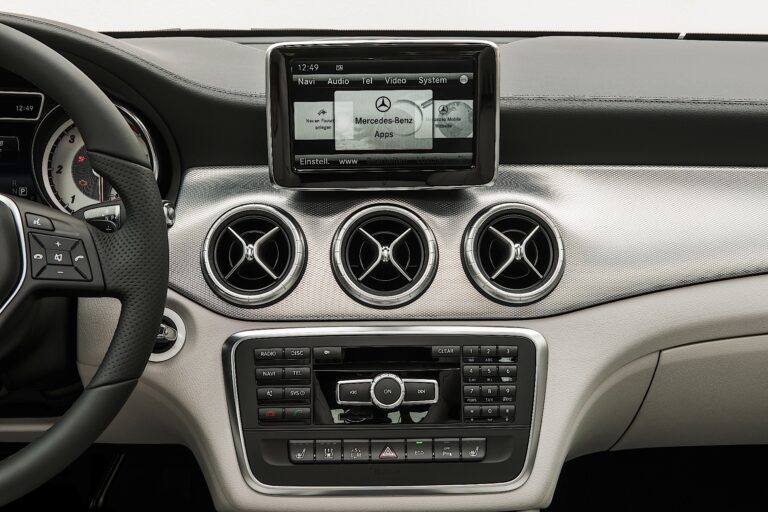 Deska rozdzielcza zawiera pięć okrągłych otworów wentylacyjnych. Zewnętrzne pierścienie okrągłych otworów wentylacyjnych mają wysokiej jakości wykończenie ze srebrno-chromowanego materiału. Kierunek strumienia powietrza ustalany jest przez galwanizowany wkład, co ujawnia staranność w detalach. Wolnostojący ekran wyświetlacza ma czarną przednią część w stylu pianina oraz, w połączeniu z COMAND Online, zapadkowo dopasowaną srebrną ramkę.