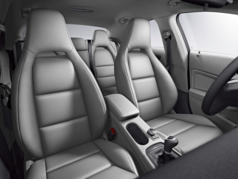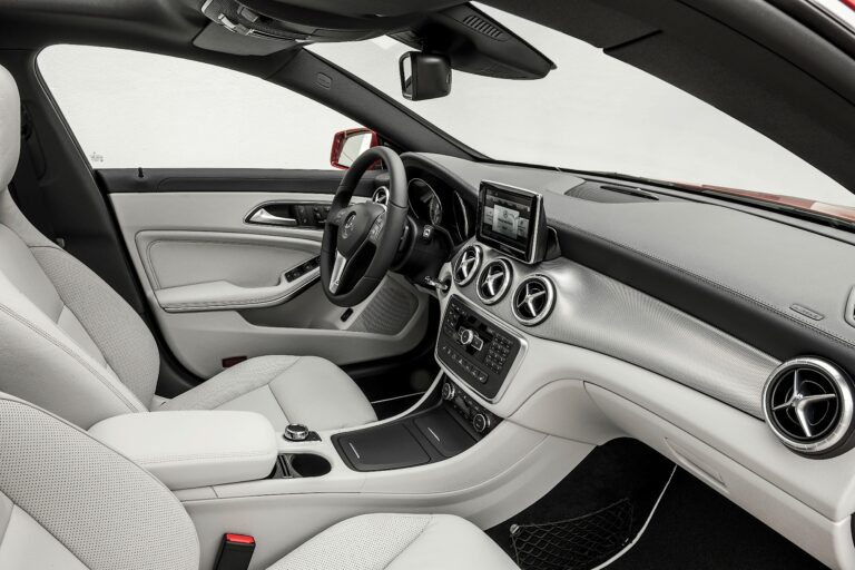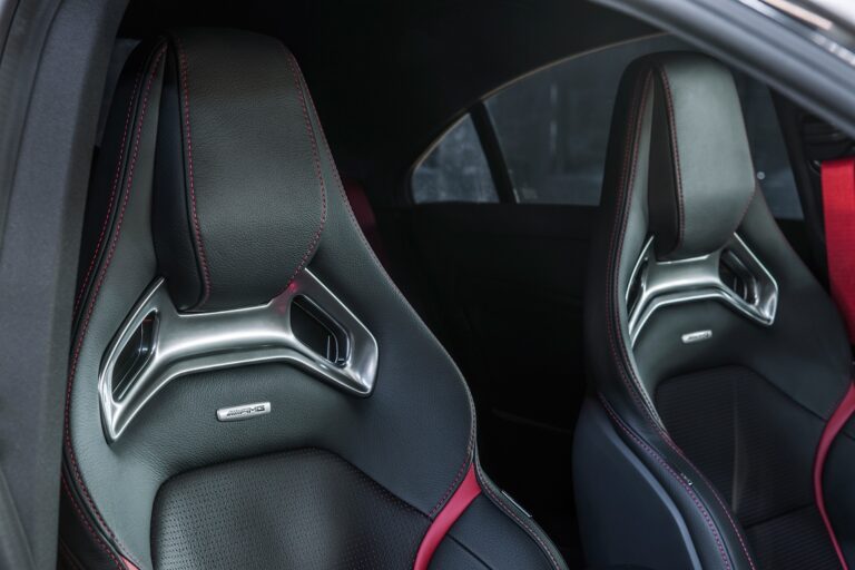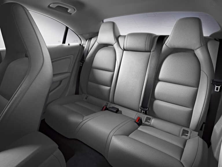 CLA wyposażony jest w integralne fotele z przodu i z tyłu, co podkreśla jego sportowy charakter. Tylna kanapa akcentuje boczne miejsca (2+1). Kolorowe kontrastowe przeszycia są dostępne zgodnie z wybranymi opcjami wnętrza. Opcjonalnie dostępny jest również kabel optyczny w otworze między zagłówkiem a oparciem jako część oświetlenia ambientowego.