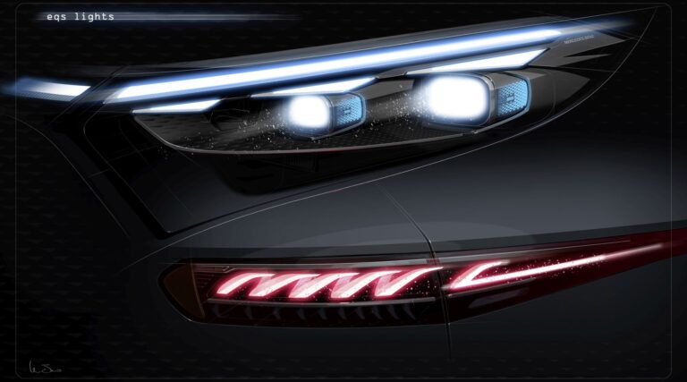 Przód połączony jest w jednostkę „Black Panel”. Reflektory połączone światłem i głęboko czarna osłona chłodnicy (Black Panel) stanowią twarz. Podczas gdy trzy punkty świetlne tworzą charakterystyczny znak świetlny dziennego biegu w EQS Saloon, w EQS SUV znajdują się trzy małe trójkąty. Inną cechą charakterystyczną jest strukturalna powierzchnia modułów oświetleniowych podświetlanych od tyłu: Trójwymiarowy wzór heksagonu w połączeniu z światłami dziennymi zapewnia rozpoznawalność. Reflektory LED High Performance są standardem, a DIGITAL LIGHT z pasem świetlnym dostępne jest jako wyposażenie specjalne.