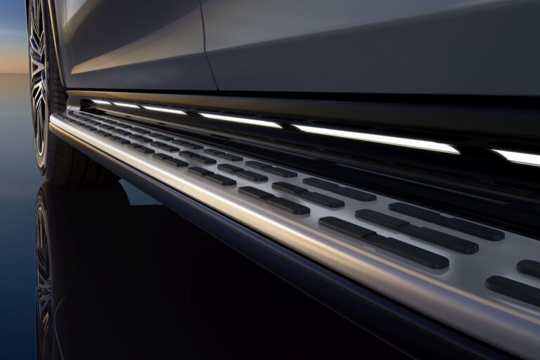 Zewnętrzne lusterka umieszczone są na barkach z powodów aerodynamicznych i akustycznych. Typowe dla SUV-a nakładki na nadkola są czarne, podobnie jak panele progowe, co zmniejsza wizualną objętość pojazdu. Opcjonalnie dostępny jest również step, który oferuje zalety aerodynamiki i ma pozytywny wpływ na zasięg elektryczny. W EQS SUV bez tego wyposażenia specjalnego, trójwymiarowe wykończenie z chromu strukturuje dolną część.