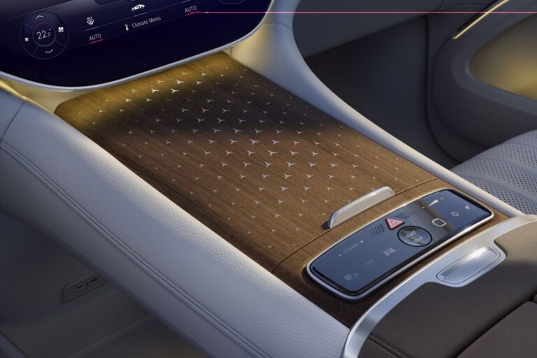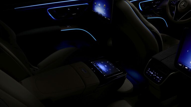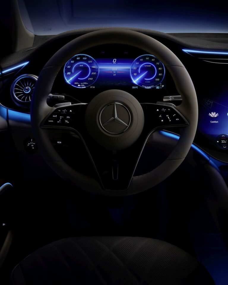 Najważniejszym elementem wnętrza jest MBUX Hyperscreen (wyposażenie specjalne). Ten duży, zakrzywiony ekran rozciąga się niemal od słupka A do słupka A. Trzy ekrany znajdują się pod wspólnym szkłem ochronnym i wizualnie się łączą. 12,3-calowy wyświetlacz OLED dla pasażera z przodu zapewnia mu osobisty obszar wyświetlania i kontroli. W Europie, a także w coraz większej liczbie krajów, pasażer na przednim siedzeniu ma również możliwość oglądania dynamicznych treści podczas jazdy. To dlatego, że Mercedes-EQ może polegać na inteligentnej logice blokowania opartej na kamerze: jeśli kamera wykryje, że kierowca patrzy na wyświetlacz pasażera, system automatycznie przyciemnia dynamiczne treści.