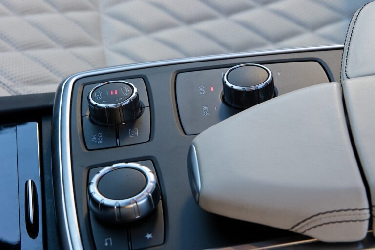 Pod centralnym podłokietnikiem z zintegrowanym podkładem na kciuk znajduje się duża przestrzeń do przechowywania, przed nią znajdują się kontroler i różne przełączniki, na przykład dla pakietu ON&OFFROAD, zawieszenia pneumatycznego AIRMATIC czy systemu COMAND. W tym miejscu zintegrowano również dwa opcjonalne podgrzewane i chłodzone uchwyty na kubki, które można zakryć wysokiej jakości drewnianą osłoną. Standardowe interfejsy USB i gniazdo AUX-IN znajdują się również na centralnym podłokietniku. Elementy dekoracyjne znajdujące się na desce rozdzielczej są również odzwierciedlone w wyrazistych dekoracyjnych szwach w wykończeniu drzwi. Opcjonalnie dostępny jest pakiet designo Exclusive: W skład niego wchodzi wysokiej jakości skóra nappa designo, niezwykle stylowe dekoracyjne szwy oraz ekskluzywne pikowanie w diamentowy wzór na siedzeniach i wykończeniu drzwi.