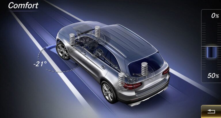 W ramach aktualizacji modelu GLC po raz pierwszy wyposażono w zawieszenie DYNAMIC BODY CONTROL z nieskończoną regulacją tłumienia na przedniej i tylnej osi. W zależności od sytuacji drogowej, prędkości i stanu nawierzchni, tłumienie jest kontrolowane indywidualnie dla każdego koła w interakcji z charakterystyką silnika, skrzyni biegów i układu kierowniczego. Dodatkowo, zawieszenie można połączyć z systemem kierowniczym o sportowym charakterze z bardziej bezpośrednim przełożeniem. Obsługiwane jest za pomocą przełącznika DYNAMIC SELECT i oferuje trzy wybieralne poziomy: Dwa poziomy „Sport” i „Sport +” zapewniają sztywniejsze ustawienie charakterystyki tłumienia, podczas gdy tryb „Komfort” zapewnia szczególnie komfortową jazdę.