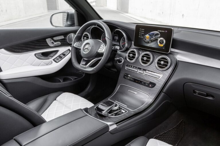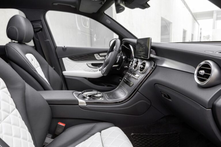 Wysokiej jakości materiały, precyzyjne wykonanie i płynne kształty – to cechy charakterystyczne wnętrza GLC. Wnętrze wersji podstawowej wykończone jest na czarno. Środkowa konsola zawiera elegancki element wykończeniowy, dostępny w wykończeniu z lakieru fortepianowego lub w dwóch nowych wykończeniach drewnianych – otwarty porowaty dąb i orzech. Linie oklein drewnianych w środkowej konsoli świadczą o doskonałym rzemiośle.