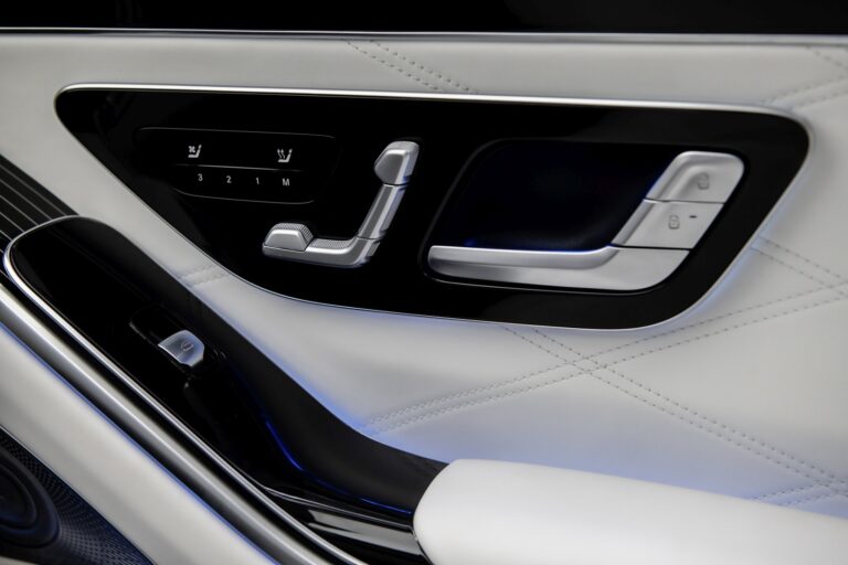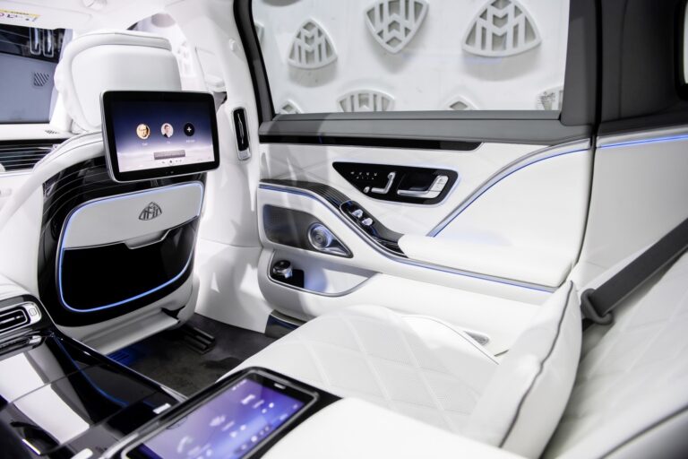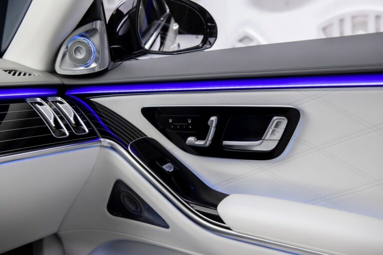 Opcjonalny pakiet High-End Interior oferuje luksus motoryzacyjny bliski doskonałości. Obejmuje First-Class Rear, tylne komfortowe drzwi, wysokiej klasy rozrywkę MBUX, system dźwiękowy Burmester® wysokiej klasy 4D, aktywne oświetlenie otoczenia, adaptacyjne tylne oświetlenie, składane stoły z tyłu, pakiet Seating Comfort package Rear w tym klimatyzację foteli, przedłużacze pasów w tylnych siedzeniach, wyświetlacz HUD z rzeczywistością rozszerzoną MBUX, wykończenie oparcia w drewnie designo, pakiet Warmth Comfort, pasy bezpieczeństwa, pakiet USB Plus oraz pakiet AIR-BALANCE.