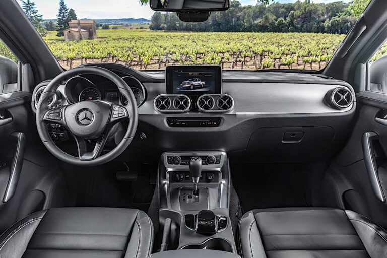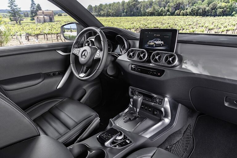 Wnętrze Mercedes-Benz X-Class podnosi komfort i jakość wykonania na nowy poziom w segmencie średniej wielkości pickupów. Specyficzny dla Mercedesa kokpit charakteryzuje się dużym elementem wykończeniowym, okrągłymi otworami wentylacyjnymi i wolnostojącym centralnym wyświetlaczem. Dzięki przejrzystemu designowi emanuje wysoką jakością i poczuciem nowoczesnego luksusu. W przypadku wyboru materiałów, linie wzornicze i wyposażeniowe PURE, PROGRESSIVE i POWER oferują wiele możliwości dalszego zróżnicowania – od plastiku o teksturze po efekt drewna, od trwałej tkaniny po prawdziwą skórę z eleganckim kontrastowym szwem. Z trzema częściami wykończeniowymi kokpitu, sześcioma pokryciami siedzeń, w tym dwoma wariantami skórzanymi z kontrastowym szwem, oraz dwoma kolorami podsufitki, X-Class zapewnia najszerszy wybór materiałów i kolorów w tym segmencie pojazdów. Dodatkowo pickup Mercedes-Benz wyróżnia się komfortem i dużą przestrzenią dla maksymalnie pięciu osób.