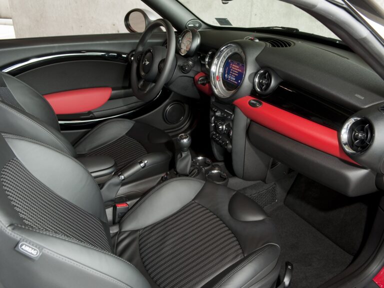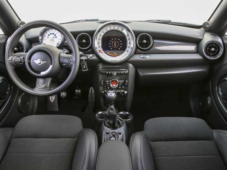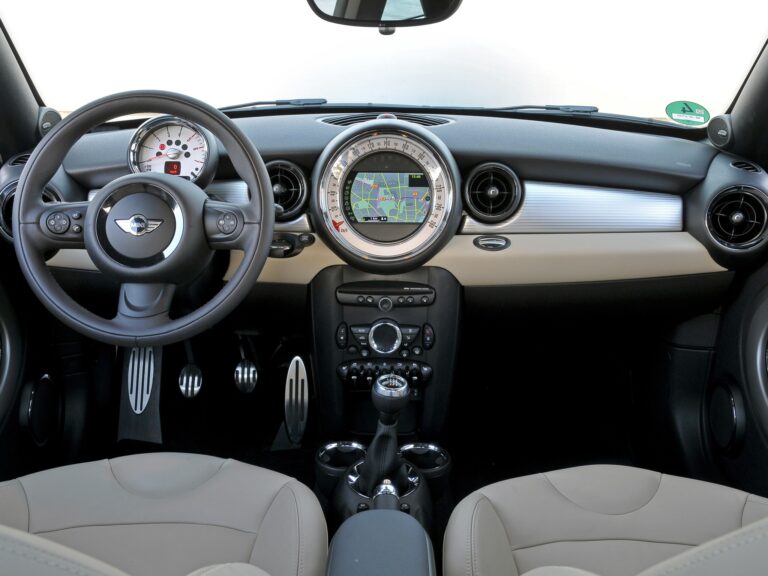 Wewnątrz kabina miała taki sam układ deski rozdzielczej jak standardowy hatchback Mini. Okrągłe wskaźniki i sportowe akcenty dopełniały dobrze wyposażone wnętrze.