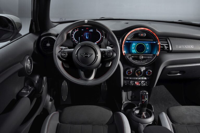 Specyficzna dla modelu skórzana kierownica John Cooper Works również zyskuje swój ekskluzywny charakter dzięki akcentom wykonanym w procesie druku 3D. Oprócz czerwonych przeszyć, obręcz kierownicy wykonana z miękkiej skóry nappa ma też metalowe oznaczenie na 12. godzinie, stworzone w procesie wytwarzania addytywnego. Łopatki zmiany biegów na kierownicy również wykonane są w technologii 3D z metalu. Oprócz logo GP na powierzchni łopatek widoczna jest charakterystyczna struktura plastra miodu. Kolorowe akcenty w ciemnym kokpicie zapewniają czerwone logo GP na dywanikach, pasujące podwójne paski na przełączniku biegów oraz lakierowane na czerwono aluminiowe wzmocnienie za siedzeniami. Służy to jako osłona, aby zapobiec przesuwaniu się bagażu do przodu w przypadku nagłego hamowania.