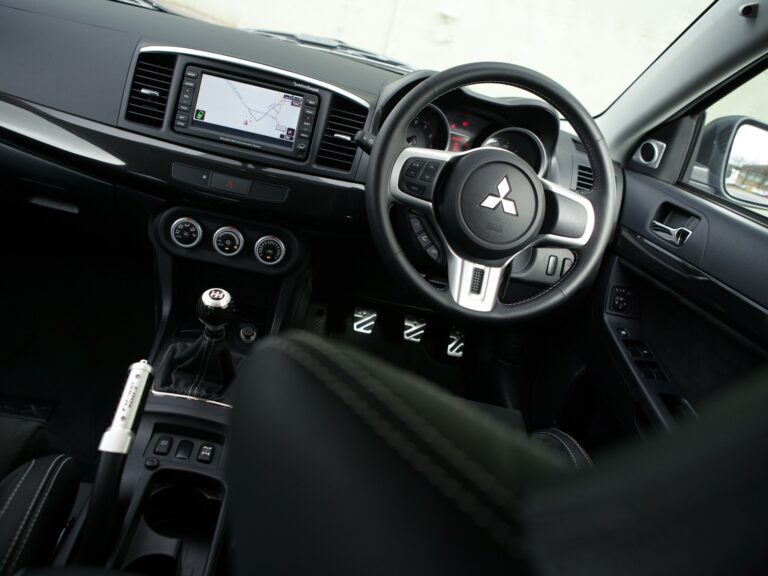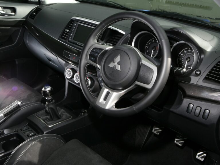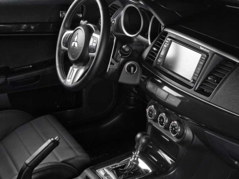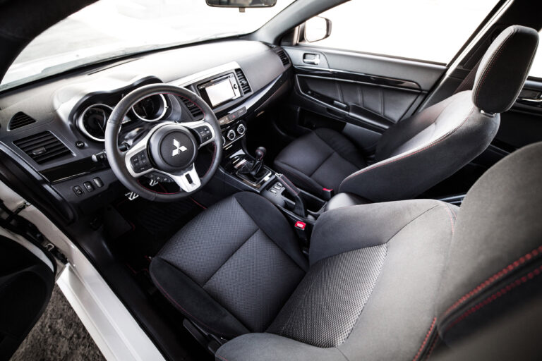 Mitsubishi sprzedawało Lancer Evolution X w kilku wersjach wyposażeniowych, w zależności od rynku i roku modelowego. Podstawowa wersja miała skromne fotele i tylko kilka opcji. Tymczasem wersja najwyższa wyposażona była w sportowe fotele Recaro z wysokimi oparciami i zintegrowanymi zagłówkami. Ich mocno wyprofilowane boki trzymały pasażerów w miejscu podczas szybkich zakrętów. Kierowca miał przed sobą deskę rozdzielczą z dużymi wskaźnikami prędkościomierza i obrotomierza, które flankiwały mały wyświetlacz LCD pokazujący dane z komputera pokładowego. Na górze centralnej konsoli, pomiędzy nawiewami, Mitsubishi zainstalowało ekran dotykowy do systemu multimedialnego, który w opcji oferował nawigację oraz system audio Rockford Fosgate. Kanapa z tyłu była płaska i nie zapewniała zbyt wiele miejsca na nogi dla pasażerów, choć wystarczała na krótkie przejażdżki.
