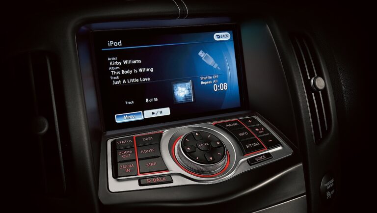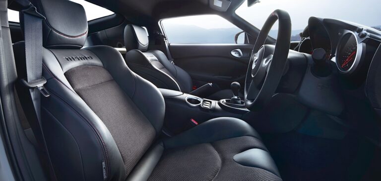 Sportowe, plecione fotele mają standardowe 8-kierunkowe manualne ustawienia kierowcy i 4-kierunkowe ustawienia pasażera oraz regulowane aktywne zagłówki. Standardowe funkcje komfortu i wygody wnętrza obejmują inteligentny kluczyk Nissan® z systemem uruchamiania przyciskiem, elektryczne szyby z funkcją automatycznego podnoszenia/opuszczania, elektryczne zamki drzwi z funkcją automatycznego blokowania oraz automatyczną klimatyzację. Standardowo dostępny jest system audio AM/FM/CD/AUX z czterema głośnikami. Dodatkowo dostępny jest pakiet Bose® z odtwarzaczem 6CD w desce rozdzielczej, dwoma dodatkowymi głośnikami (łącznie sześć), dwoma subwooferami, systemem telefonu Bluetooth® Hands-Free, automatycznie ściemnianym lusterkiem wewnętrznym i uniwersalnym nadajnikiem HomeLink®. Nie oferuje się żadnych innych opcji.
