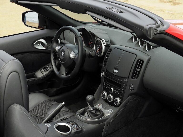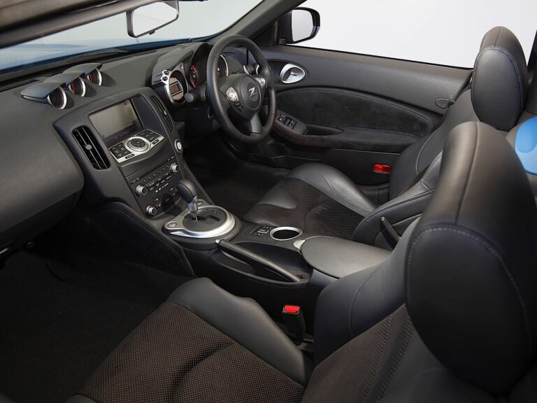Wnętrze Nissan 370Z Roadster jest dostępne w czarnej tkaninie lub dla wersji 370Z Touring Roadster, w wyborze siedzisk skórzanych w kolorze szarym, czarnym lub wina.