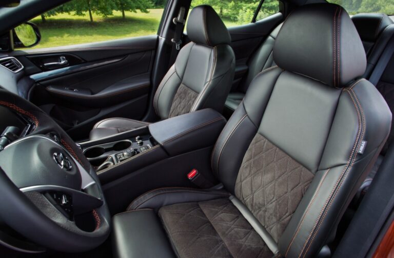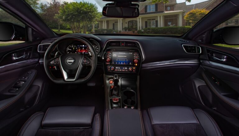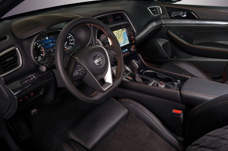 Wewnątrz, dramatyczny korpus Nissan Maxima to kokpit skierowany do kierowcy oraz komfortowe siedzenia dla pięciu pasażerów. Podnosząc już wysoki poziom jakości i premium luksusowego wykończenia Maximy, wprowadzono nowy wzór wstawki siedzeń i ciemny podsufitkę oraz słupki w wersjach SR i Platinum Reserve. Pakiet Platinum Reserve zawiera specjalne wykończenie z pół-anilinowej skóry Rakuda Tan, podobne do tego, które jest dostępne w pakiecie premium wnętrza Nissan GT-R.
