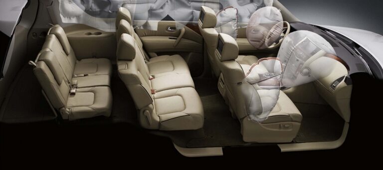Wyposażony w sześć poduszek powietrznych klasy premium, Nissan Patrol ma również całkowicie zaktualizowany system klimatyzacji z innowacyjną funkcją – wentylacją kurtynową. Wentylacja kurtynowa ma kilka małych, ale bardzo skutecznych otworów wentylacyjnych umieszczonych w suficie nad każdym bocznym oknem, które dmuchają silny strumień chłodnego powietrza w dół, tworząc kurtynę powietrzną, która działa jak bariera przed przenikaniem ciepła do wnętrza pojazdu.