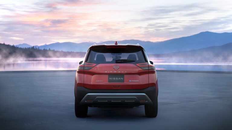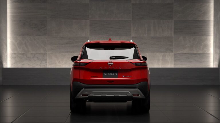 Z tyłu mocna pozioma linia znajduje się tuż nad i poniżej miejsca montażu tablicy rejestracyjnej, a podzielone tylne światła zapewniają szeroki otwór do bagażnika. Srebrna płyta zakręca pod tylnym zderzakiem, odzwierciedlając przygodowy charakter X-Trail.
