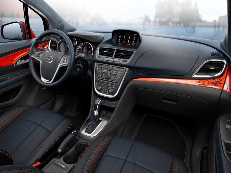 Szczyptę stylu i elegancji wnosi do Opla Mokki wyższy poziom wyposażenia „Cosmo”, gdzie znajdziemy tłoczone tkaniny siedzeń i wysokiej jakości dwukolorowe przeszycia w całym wnętrzu, podkreślające jego wyrafinowanie. Podłokietniki w skórze „Moroccana” są dostępne w kombinacjach Jet Black/Dark Galvanized lub nowej brązowej Cocoa/Saddle Up. Deska rozdzielcza i dekoracja drzwi są pokryte wyrazistym tungstenowym szczotkowanym (fotele Jet Black) lub bronzowym sephia (fotele Cocoa). Dla jeszcze bardziej luksusowej atmosfery klienci mogą wybrać czarne lub brązowe fotele skórzane Cocoa/Saddle Up.