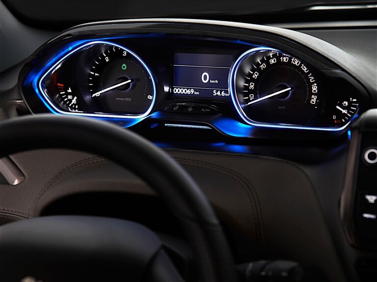 Tak jak na zewnątrz, sygnatura świetlna jest integralną częścią wnętrza 2008. Tak więc atmosfera na pokładzie jest wyjątkowa. Idealnie umieszczone w polu widzenia, wyświetlacze head-up w wyższych wersjach są otoczone niebieskim podświetleniem LED, podczas gdy w innych wersjach są chromowane.