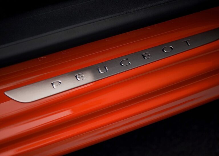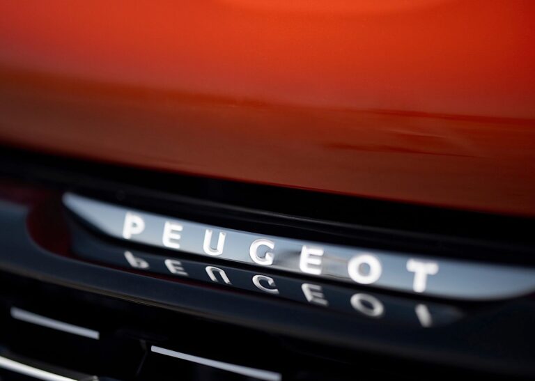 Czerwone napisy Peugeot z przodu i z tyłu.