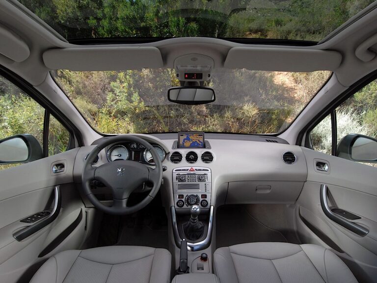 Producent zamontował fotele kubełkowe z przodu oraz dzieloną kanapę z tyłu we wnętrzu. Dzięki wyższej pozycji siedzącej, wszyscy pasażerowie mieli wystarczająco dużo miejsca na nogi. Niemniej jednak, pasażer siedzący na środkowym miejscu z tyłu miał trudności z przejściem, które biegło wzdłuż całego pojazdu. Deska rozdzielcza w jakiś sposób przypominała niemieckiego konkurenta, Volkswagena Golfa. Znajdowały się na niej wskaźniki umieszczone w górnej części, z szerszymi tarczami dla prędkościomierza i obrotomierza. Ponadto, model 308 pokazał wyraźną poprawę w materiałach, spasowaniu i wykończeniu w porównaniu do 307.
